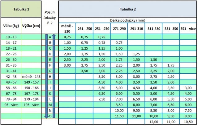 - Hmotnost lyžaře – tabulka vám nabízí rozpětí vždy po cca 3 kg.